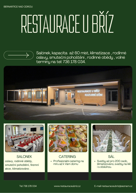 Vítáme Vás na webových stránkách Restaurace U Bříz v Bernarticích nad Odrou. Restaurace a celý objekt prošel v roce 2025 kompletní rekonstrukcí. Restauraci jsme otevřeli v roce 2014 s nelehkým úkolem a to znovu přivést společenský život do této krásné obce a to se nám v průběhu let zcela podařilo. Nyní se řadíme mezi nejvíce navštěvovanou restaurací v širokém okolí. Po kompletní rekonstrukci bubou očekávání ještě větší než doposud a mi máme rádi výzvy a těšíme se na ně. Restaurace je oblíbená pro uspořádání rodinných oslav, smutečních pohoštění, svateb, firemních večírků, školení firem, rodinných obědů, oblíbená zastávka cyklistů a turistů.